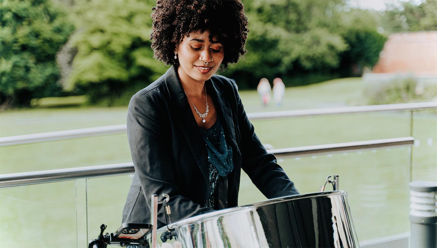 Ayeshah’s journey into the steelpan world began at the age of six, attending practice at her local African Caribbean community centre in Leicester. Ten years later, her dedication and skill earned her a spot in Contrast, the band led by her pan teacher, which eventually paved the way for her to go freelance as Zola Steelpan, performing at events from weddings to festivals.